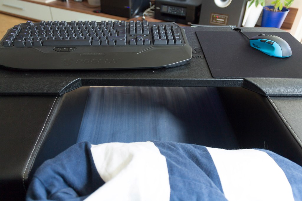 Doch wie angenehm ist es nun wirklich mit dem Couchmaster Cycon zu spielen? Kurz gesagt – es ist unheimlich bequem. Vielleicht schon zu bequem für langandauernde, spannende Gefechte, bei denen man nicht müde werden sollte. Die Polster haben eine angenehme Höhe, die Handballenauflagen sind sinnvoll angebracht, die Abmessungen für die großen und schlanken Tester genau richtig. Die Auflage lässt sich schnell auf einen Polster schieben, um aufstehen zu können, ebenso schnell ist sie auch wieder platziert. Im Test funktionierten auch der USB-Hub und die -Verlängerung problemlos. Manchereins könnte es allerdings stören, dass der Platzbedarf des Couchmasters doch relativ groß und der Preis mit etwa 130 Euro nicht gerade gering ist.