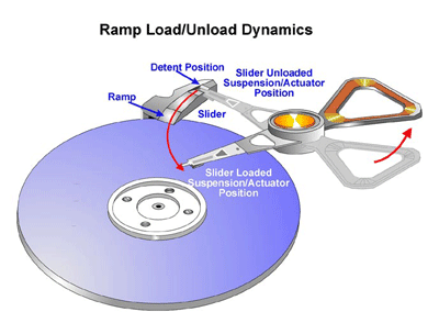 . Indem die Köpfe bei Nichtgebrauch auf einer Art Rampe abgelegt werden, verhindert man, dass sie in ständigem Kontakt mit den Datenträgern stehen und deren Verschleiß beschleunigen. In herkömmlichen Laufwerken "landen" die Köpfe wenn die Umdrehungsgeschwindikeit der Festplatte abnimmt in sogenannten "landing areas", speziellen aufgerauhten Oberflächen der Metallscheiben die sich an unterschiedlichen Positionen befinden kann und die für die nötige Haftreibung zwischen Kopf und Scheibe sorgen. Durch genaue Berechnungen kann man dann diese "start/stop zones" bestimmen. Dies bringt aber weitere Probleme mit sich, da die Flughöhe der Köpfe an die andersartige Oberflächenstruktur dieser Bereiche angepasst werden muss. Somit hat eine Rampe sogar einen weiteren Vorteil: Die Beschichtung der Trägermedien kann homogener erfolgen, da die start/stop zones aufgrund der Rampe nicht mehr benötigt werden, sodass die Köpfe in einem niedrigeren Abstand über der Oberfläche schweben können. Dies ist z.b. bei der perpendikulären Aufzeichnung von zentraler Bedeutung. (näheres s. Seite 6)
