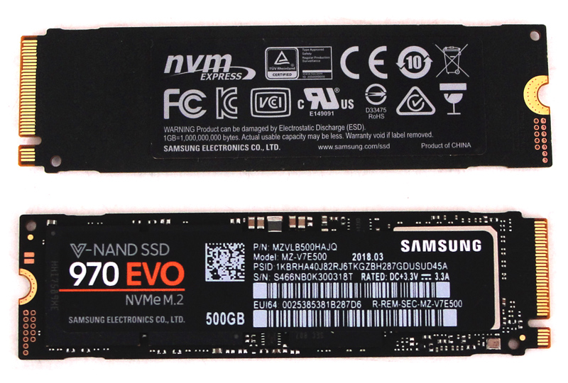 Wie bereits im Vorwort erwähnt, richtet sich die SSD 970 EVO an Tech-Enthusiasten und Profis, die hohe Übertragungsgeschwindigkeiten für intensive Workloads auf PCs und Workstations benötigen. Um diese Vorgaben erfüllen zu können, unterstützen die Drives der Familie das NVMe-Protokoll und werden per PCI-Express 3.0 mit 4 Lanes angebunden. Herzstück der SSDs ist der bereits von anderen Designs bekannte Samsung Phoenix-Controller S4LR020, der u.a. Verschlüsselungs-Technologien wie AES 256 Bit, IEEE-1667 (Microsoft eDrive) und TCG Opal 2.0 sowie den DEVSLP-Stromsparmodus unterstützt. Die NVMe-Laufwerke der 970 EVO Familie sind mit der vierten Generation von Samsungs V-NAND ausgestattet. Dabei handelt es sich um 3D-TLC-NAND mit 64 Lagen, der hohe Packungsdichten möglich macht. Flankiert wird der Controller von einem LPDDR4-DRAM-Cache, der im Falle unseres 500-GB-Samples 512 MB groß ist und mit der Speicherkapazität der SSDs skaliert.