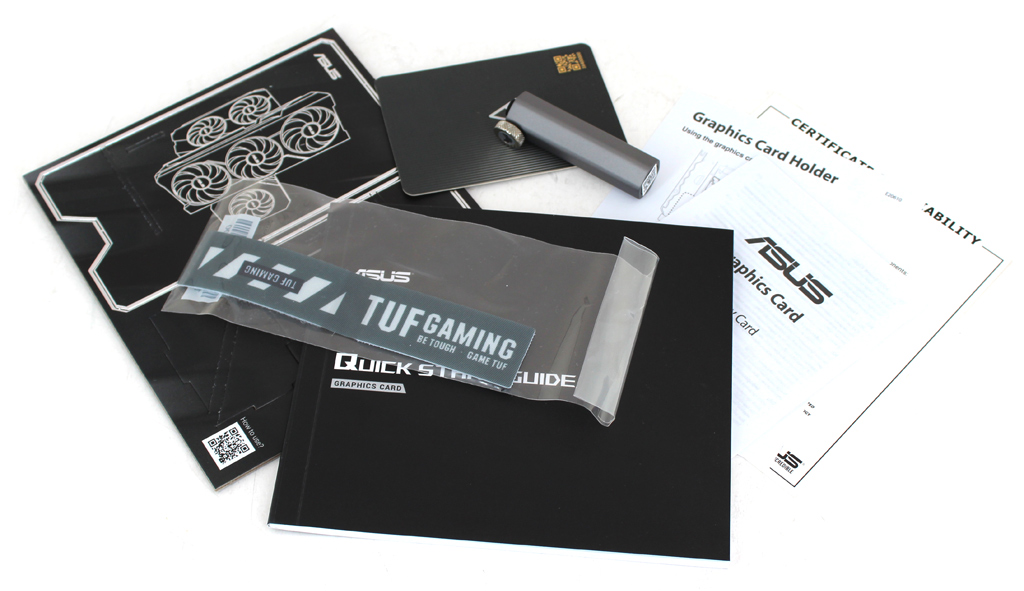 In der Verpackung der Karte finden wir verschiedene Dokumente, wie Hinweise für den Software-Download (z.B. für ASUS GPU Tweak III), zur Garantie oder einen Quick Start Guide. Außerdem legt ASUS ein TUF Velcro Hook & Loop (Klettband) und einen praktischen Phone-Holder zum Basteln bei. Um die wuchtige Quad-Slot-Grafikkarte ruhigen Gewissens auf dem Mainboard im Gehäuse zu montieren, liegt dem Paket auch eine Graphics Card Holder bei (ASUS TUF Graphics Card Holder), der den PEG-Slot des Mainboards mechanisch entlasten soll.
