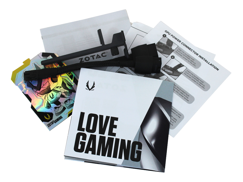 Neben einem Quick Installation Guide sowie weiterer Dokumentation zu verschiedenen Themen, finden wir auch einen passenden Adapter für die Stromversorgung der Karte im Karton. Ebenfalls mit enthalten ist ein „GPU Support Stand“, der die massive Grafikkarte stützen und das Mainboard bzw. den PEG-Port mechanisch entlasten soll.