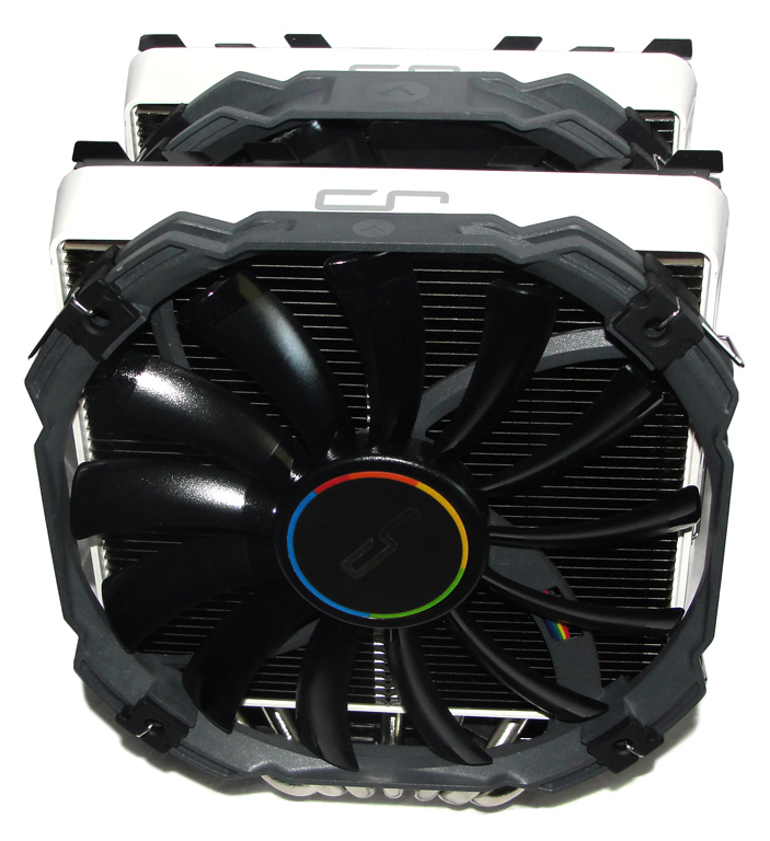 Wie der ebenfalls im Test befindliche Cryorig H5 Ultimate, basiert auch der R1 Universal auf einem massiven, vernickelten Kupferkern. Dieser ist über insgesamt sieben 6-mm-Heatpipes mit den beiden Radiatoren (Doppel-Tower-Design) verbunden. Der vordere der beiden Tower ist mit 42 Aluminiumlamellen (2,4 mm Abstand) ausgestattet, der hintere mit 53 Fins (1,8 mm Abstand). Dies wird von Cryorig als „Jet Fin Air Acceleration“ beworben und soll für eine Beschleunigung des Luftstroms durch den Kühler sorgen. Die bei unserem Exemplar weißen Kunststoffabdeckungen sind übrigens auch in anderen Farben erhältlich – nachträglich, käuflich erwerbbar.