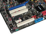Mit zum oberen Mainboardteil gehört auch das Back-Panel, das eigentlich alle auf dem Board verfügbaren Anschlüsse nach außen schleift. So finden wir folgende Schnittstellen: PS2 für Tastatur und Maus, serieller COM-Port, Digital-Audio via Chinch und optischem Leiter, FireWire 400 und eSATA, RJ45 Gigabit-Ethernet, sowie 4x USB 2.0. Für die übrigen FireWire- und USB-Ports liegen Slotbrackets bei bzw. können an das Front-Panel angeschlossen werden.