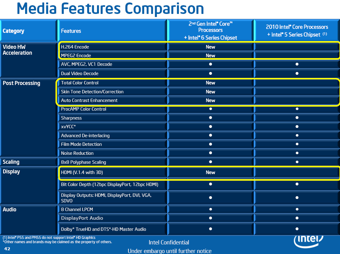 Außerdem unterstützen HD 2000 bzw. HD 3000 erstmals DirectX 10.1, OpenGL 3.0 sowie Shader Model 4.1. Auch die Videobeschleunigung in Hardware hat man erweitert, so dass nun auch die Formate H.264 und MPEG2 enkodiert werden können. HDMI 1.4 und 3D-Unterstützung zählen ebenso zum Featureset der Sandy Bridge Grafik. Folgend haben wir alle wichtigen technischen Eckdaten im Vergleich zur Vorgänger-Generation (Codename Westmere) für Sie zusammengetragen.