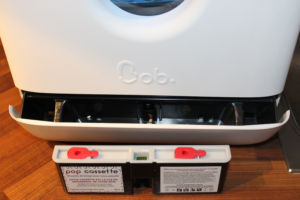 Meiner Meinung nach ist die Einrichtung des WLAN für Anwender, die technisch nicht sehr versiert sind, ziemlich umständlich. Einfacher wäre es, wenn das Gerät über ein App und Bluetooth verwaltet werden könnte und die Verbindung zum WLAN über die App erfolgen würde. So könnten auch die weiteren Funktionen (mehr dazu im nächsten Abschnitt) einfacher zugänglich gemacht werden, ohne sich jedes Mal auf der Webseite einloggen zu müssen. Zuletzt muss noch die „pop cassette“ eingebaut werden. Darin befinden sich Spülmittel, Klarspüler und Salz für 30 Waschgänge. Dazu kann unten ein Fach aufgeklappt werden, in das die cassette einfach hineingesteckt wird.