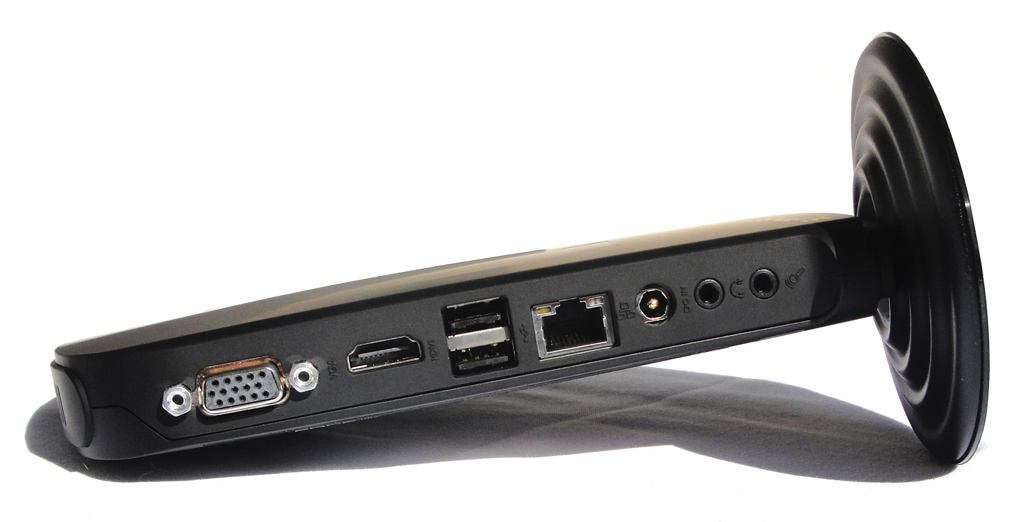 Dünn wie ein Buch (19,3 x 14,8 x 2,2 cm) und 530 g leicht, so kommt die zweite Generation der EDGE HD daher. Durch die geringen Maße lässt es sich gut an einem freien Platz im Schrank unterbringen und würde auch im Bücherregal auf den ersten Blick kaum auffallen. Eine zweite Installationsmöglichkeit bietet die beiliegende VESA-Halterung, womit die EDGE HD2 hinter den Flachbildschirm montiert werden kann und so gar nicht mehr auszumachen ist. Der traditionell benötigte Platz für den PC entfällt somit vollständig und es bleibt mehr Freiraum auf dem Schreibtisch. Angeschlossen wird der Bildschirm wahlweise über VGA oder HDMI. Beide Schnittstellen sind, wie die meisten anderen, an der Rückseite des Gerätes angebracht. Hier befindet sich auch jeweils eine 3,5 mm Buchse für den Audioeingang sowie Audioausgang und die RJ45-Buchse des Gigabit-Ethernets. Zwei der insgesamt vier USB-2.0-Schnittstellen sind von vorne erreichbar, man braucht also nicht erst hinten an das Gerät heran um z.B. schnell einen USB-Speicher anzuschließen.